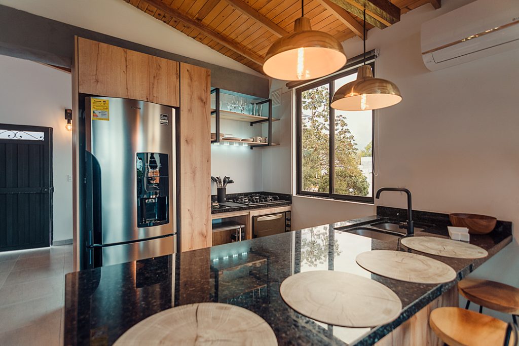 Cocina equipada (Nevera, horno microondas, quemador a gas, menaje)