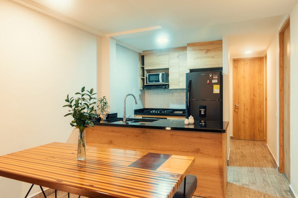 Cocina equipada (Nevera, horno microondas, quemador a gas, menaje)