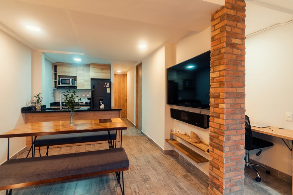 Nos complace invitarle a un elegante y amplio apartamento de estilo rústico y boho chic, cuidadosamente diseñado para ofrecer el máximo confort. Ubicado en una zona inmejorable, este refugio destaca por su luminosidad donde podrá disfrutar de su hermosa vista desde la comodidad del sofá cama, relajado en la hamaca o simplemente mientras preparas una deliciosa cena.