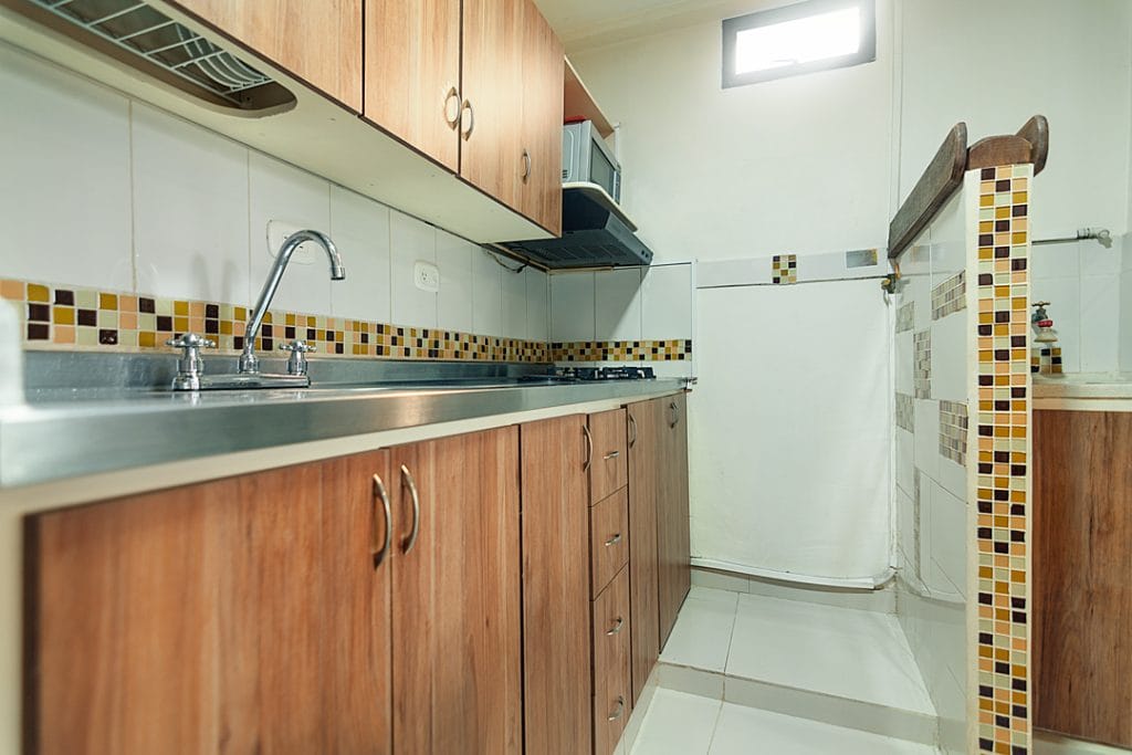 Cocina equipada (Nevera, horno microondas, quemador a gas, menaje)